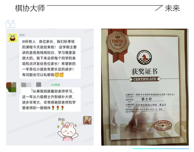 从六级棋士到棋协大师,蔡子妤的每一步突破,源于她自己的专注与坚持,离不开妈妈在身后的温暖陪伴,也离不开超玥网校老师们的专业指导。棋路漫漫,成长有迹。愿每位小棋手都能在热爱中前行,在支持中进步——你的每一次努力,都通向更远的远方。 超玥国际象棋网校寒假集训火热招生! 想像子妤同学一样,在比赛中不断晋级、持续突破吗? 想要体验超玥网校系统、专业的国际象棋课程体系吗? 渴望在全国赛场上沉着应战、稳步迈向更高荣誉吗🏆 你,也想成为下一位棋协大师吗? 那就别再等待——立即报名,开启你的晋级之路!👊 ![]() (点击图片查看课程详情)