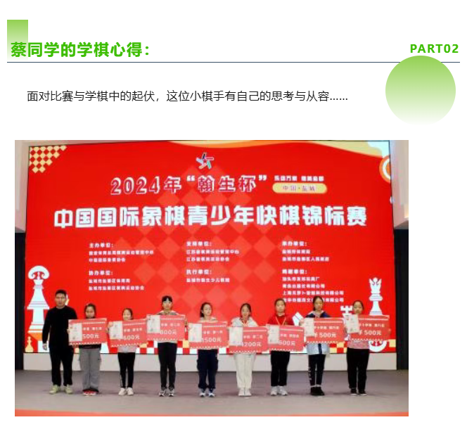 Q:在比赛过程中你如何调节自己的心态呢? A: 比赛开始前,如果感到紧张,我会深呼吸,想想自己平时练习时的样子。比赛中遇到难走的局面,我会默默告诉自己:“不要着急,要相信自己”。当我专注于对局本身,也就不会再去想其他的了。 Q:在你学棋遇到瓶颈是如何克服的? A: 最难的阶段是有一段时间棋力好像停滞了,赢不了也突破不了。后来我参加了一次野线爬山,六个多小时,在体力快要耗尽的时候我终于爬上了山顶,那一刻我在想,下棋就像爬山,真正的强大,不是永远向上,而是无论身处峰顶还是谷底,始终相信自己在路上。而保持动力的秘密,大概就是永远记得第一次将军时的快乐吧。 Q:接下来你会怎么安排学棋呢? A: 明年我想尝试参加李成智杯,去和更多高水平的棋手对弈。我也打算多学习大师们经典对局,想象他们在关键时刻的思考。当然学校的功课我也会一如既往认真对待,下棋教给我的专注力,反过来也让我的学习效率更高。