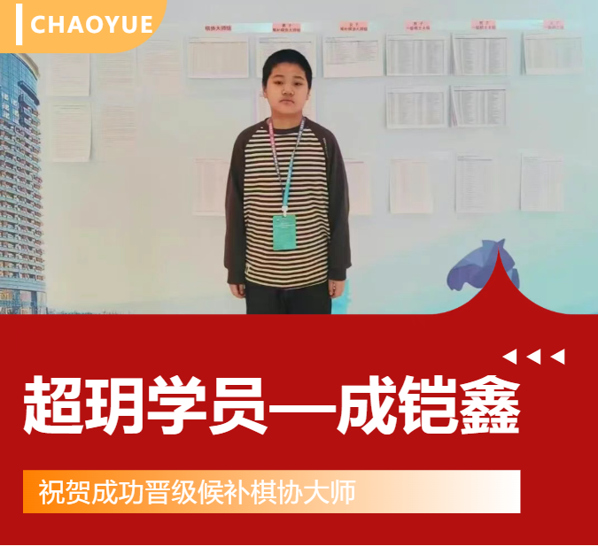 06.对孩子未来的学棋之路,您有怎样的期待? 成铠鑫父母:未来我们希望他继续认真刻苦地学棋,期待他更进一步。 棋路漫长,每一步突破都值得庆祝。选择超玥国际象棋网校,让我们陪伴每一个棋手,走向更高远的舞台。 (点击查看图片详情) 在超玥,每一个孩子都拥有书写自己故事的可能。 我们相信,给予专注的引导与扎实的训练, 他们的热爱,终将抵达更远的远方。 超玥国际象棋网校 2026年寒假集训正在火热招生中, 如果你也希望精进棋艺突破自我, 赶紧咨询报名啦~
