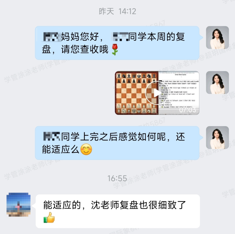 4月:国际大师陪练课惊喜上线 为满足学员的进阶练习需求,超玥网校特别增设了国际大师陪练课。沈思远老师凭借其深厚的棋艺与丰富的教学经验,帮助众多学员在陪练过程中有效巩固理论、深化实战应用,取得了扎实而迅速的进步。