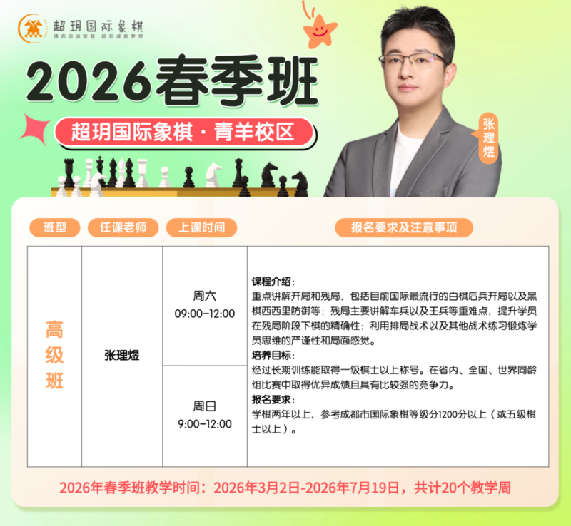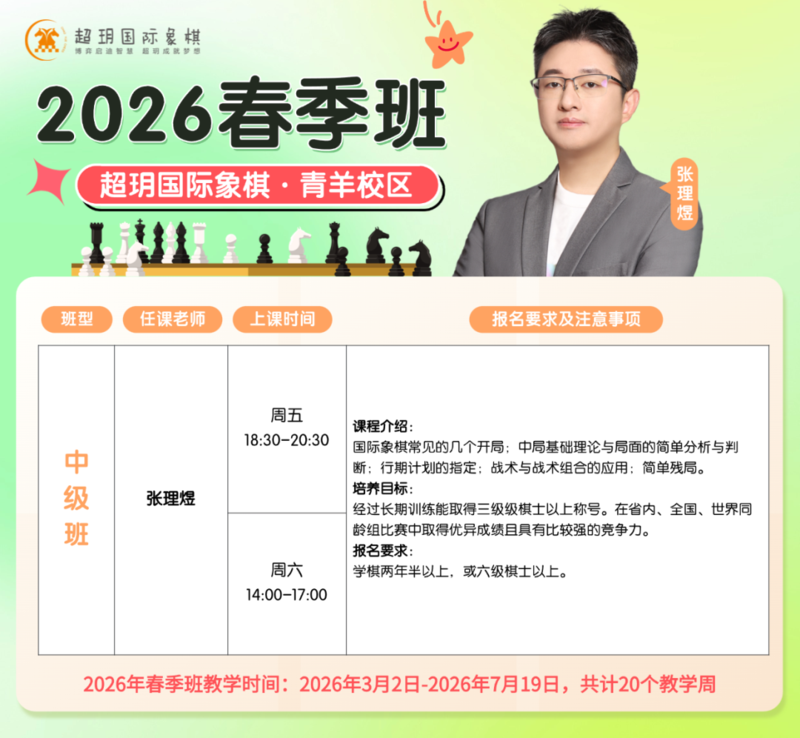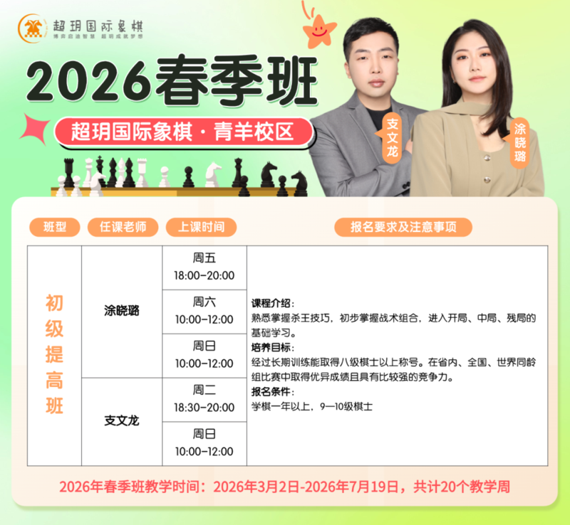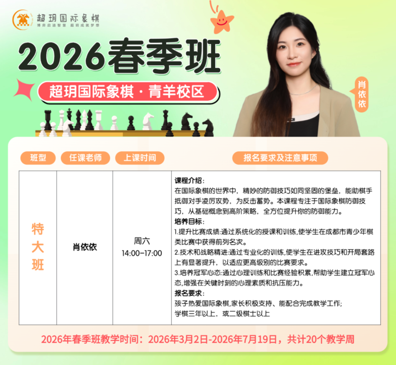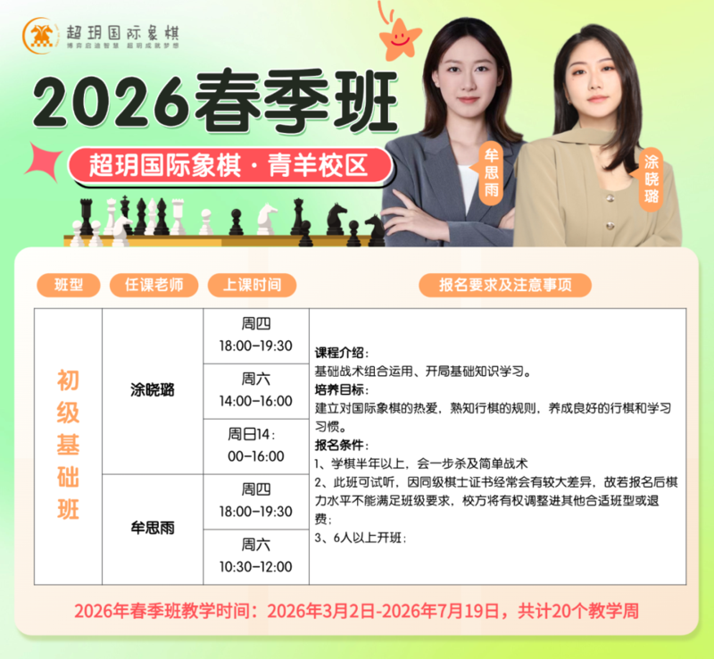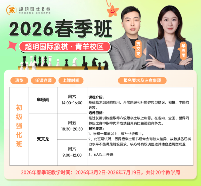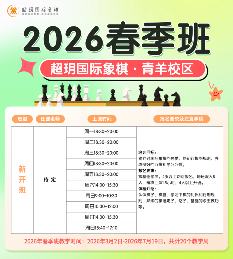 春天是万物复苏的季节, 也是孩子思维萌芽、静心成长的黄金期 超玥2026春季班现已开放报名 带孩子推开国际象棋的大门 专业教学体系 + 进阶课程设计 适合零基础到提升的各阶段学员 这个春天,让孩子学会思考,快乐成长! 📍赶紧查看课程详情,选择心仪课程吧 特大班