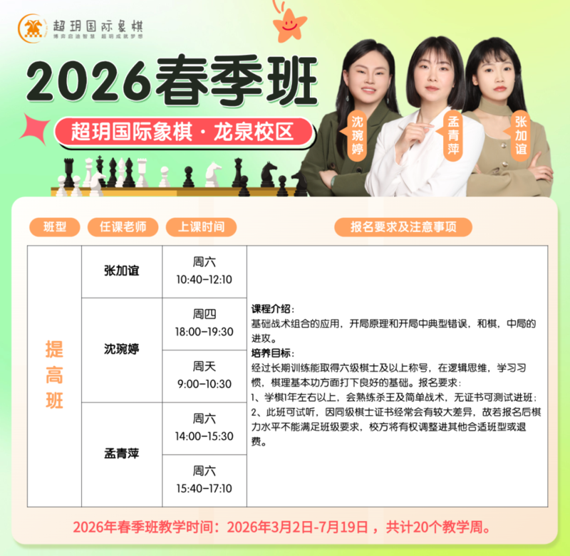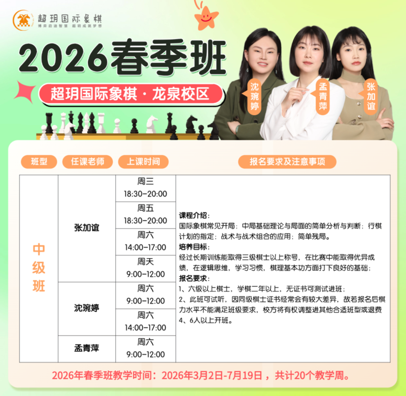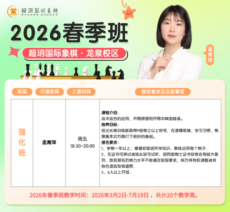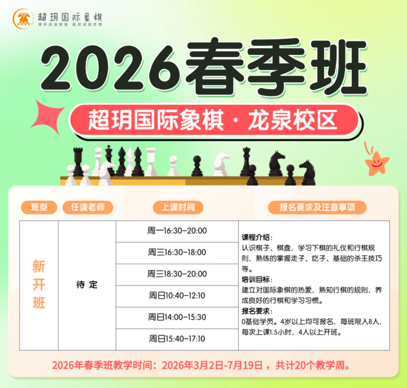 春天是万物复苏的季节, 也是孩子思维萌芽、静心成长的黄金期 超玥2026春季班现已开放报名 带孩子推开国际象棋的大门 专业教学体系 + 进阶课程设计 适合零基础到提升的各阶段学员 这个春天,让孩子学会思考,快乐成长! 📍赶紧查看课程详情,选择心仪课程吧 高级班