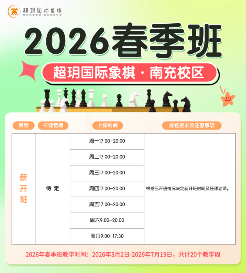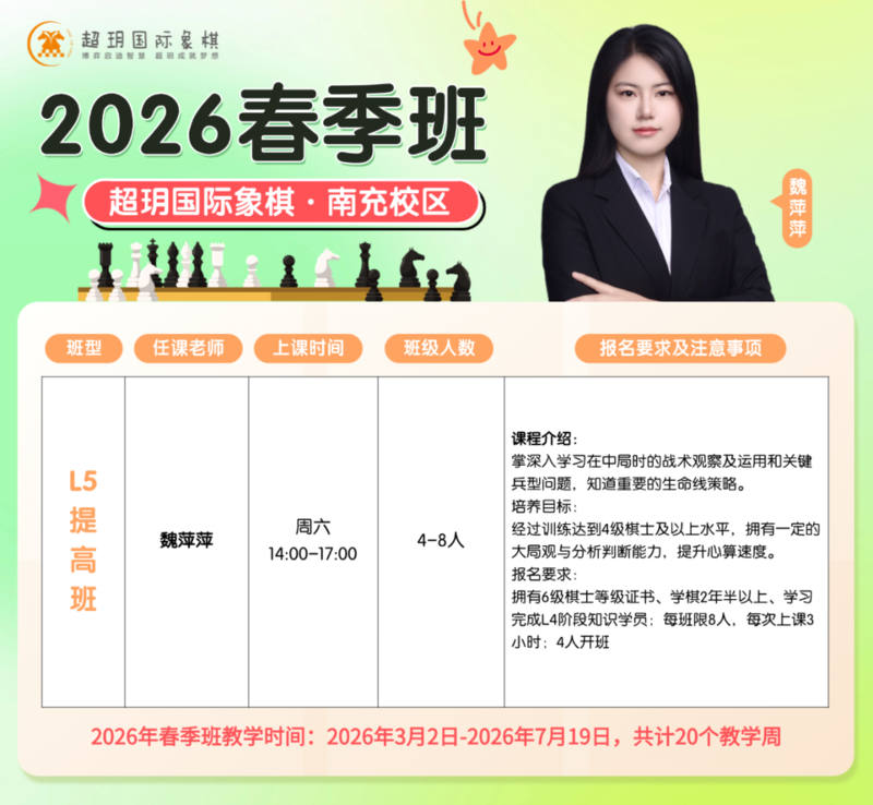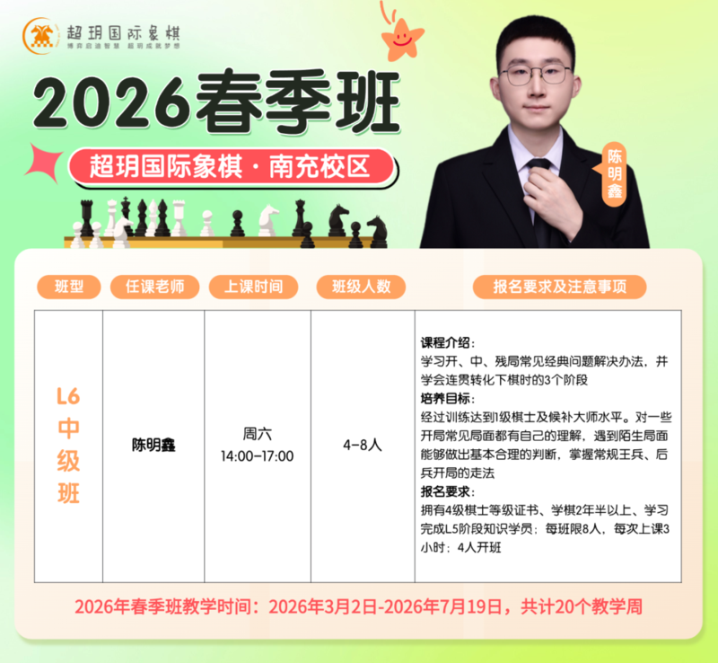 春天是万物复苏的季节, 也是孩子思维萌芽、静心成长的黄金期 超玥2026春季班现已开放报名 带孩子推开国际象棋的大门 专业教学体系 + 进阶课程设计 适合零基础到提升的各阶段学员 这个春天,让孩子学会思考,快乐成长! 📍赶紧查看课程详情,选择心仪课程吧 L6中级班